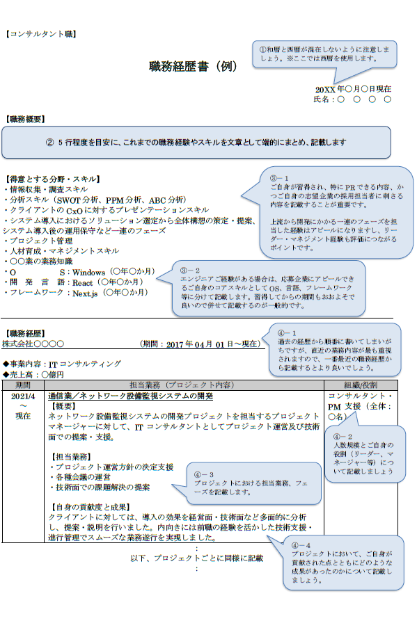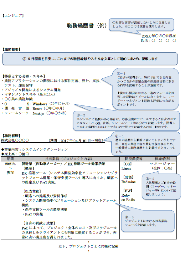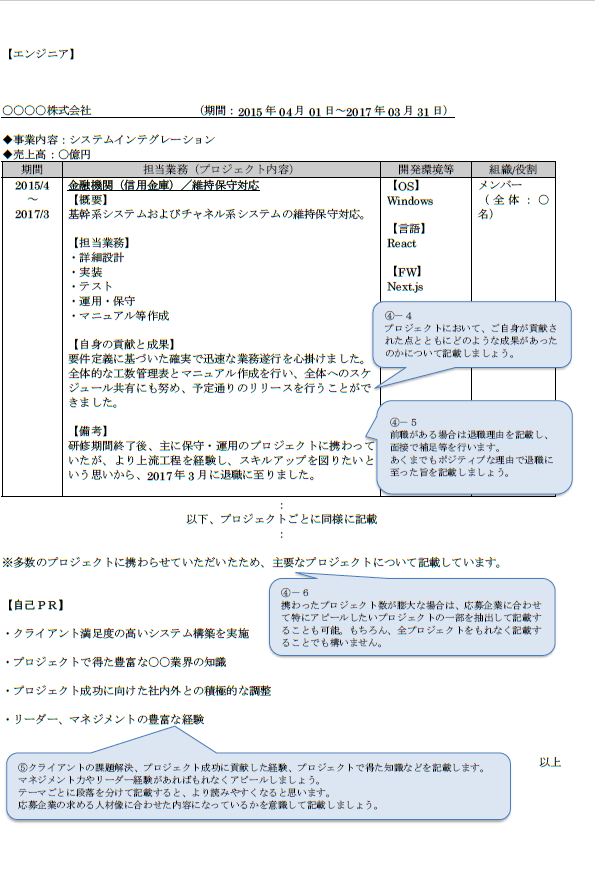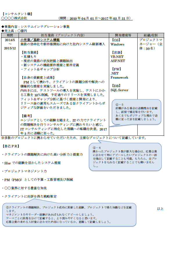 エンジニアやコンサルタント職の方はプロジェクトごとにまとめて、以下の点に留意しながら作成してください。